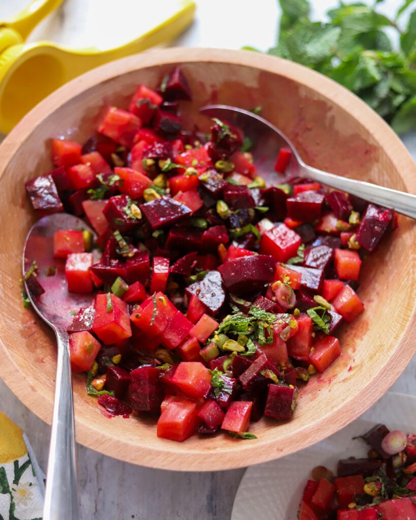 While beets aren't technically a spring vegetable, these colorful jewel toned root veg satisfy the cravings for vibrant flavor. With fresh mint, pistachios and a dijon lemon dressing, this salad is bright, tasty and perfect for Springtime.